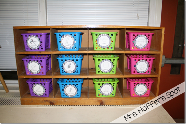 Where I keep all of their supplies, Purple and Blue are school supplies and green and pink are math manipulatives. They can freely go get what they need, without asking and not interrupting instructional time.